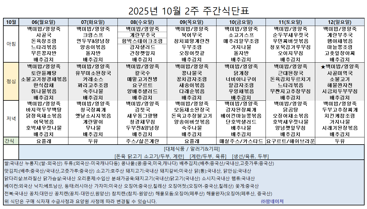 10월 2주 한 주간의 식단표는 다음과 같습니다.