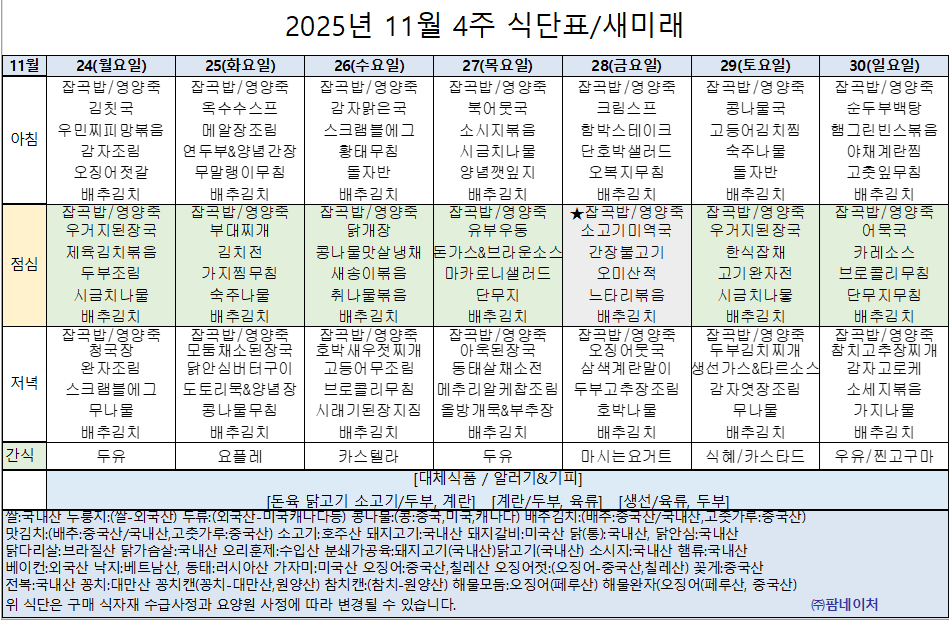 2025년 11월 4주 주간식단표