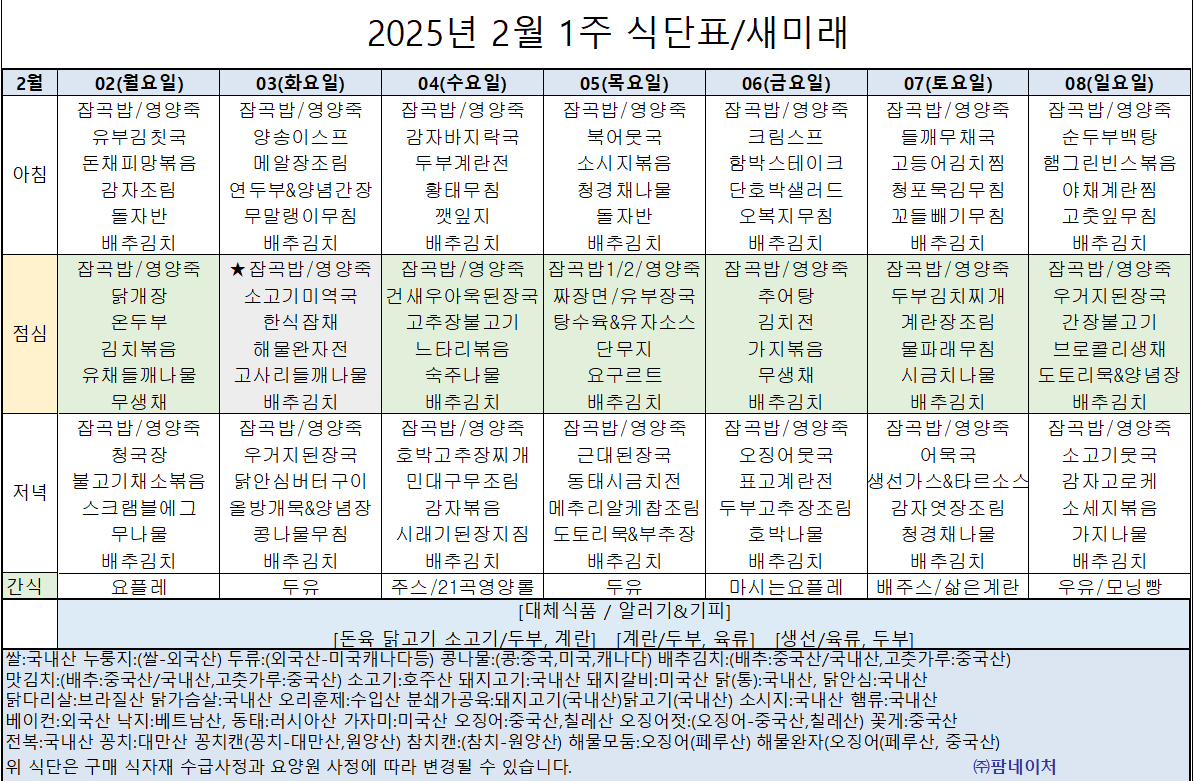 2월 첫째주 한 주간의 식단표는 다음과 같습니다.