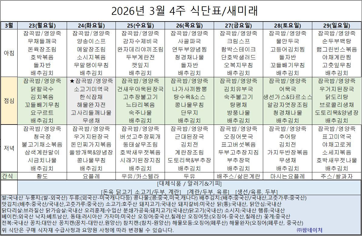 3월 4주 한 주간의 식단표는 다음과 같습니다.