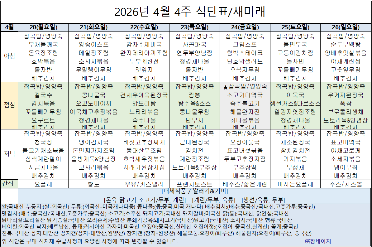4월 4주 한 주간의 식단표는 다음과 같습니다.