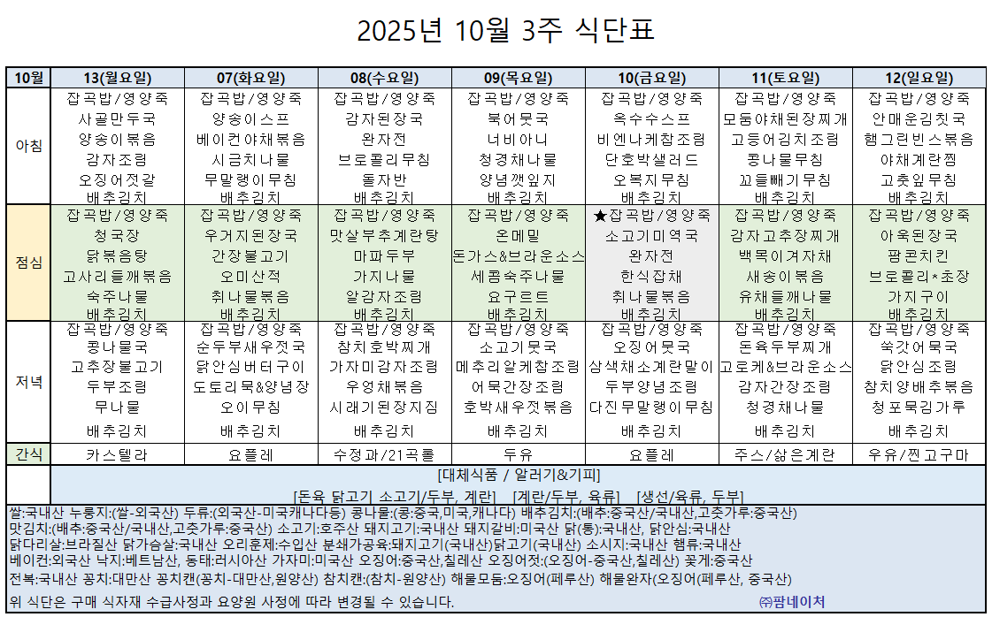 10월 3주 한 주간 제공될 식단표는 다음과 같습니다.