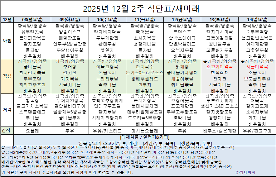 12월 2주 한 주간의 식단표는 다음과 같습니다.