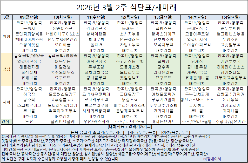 3월 2주 한 주간의 식단표는 다음과 같습니다.